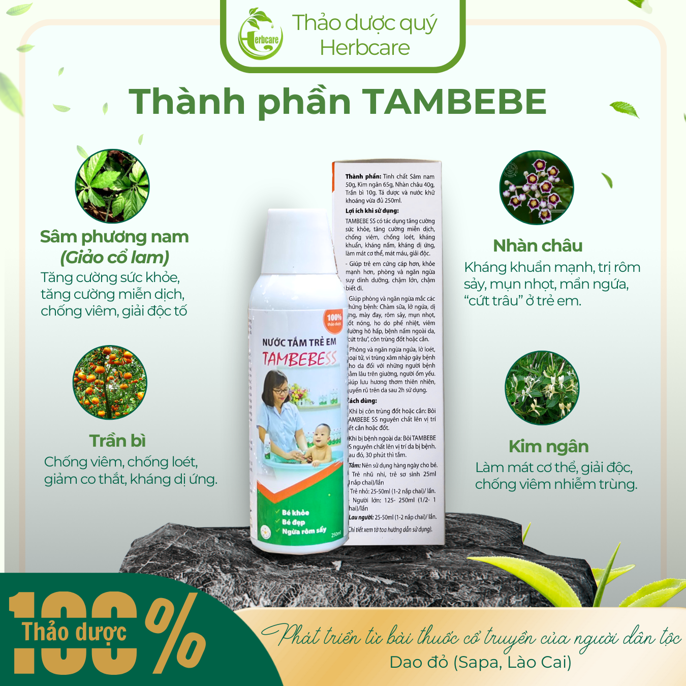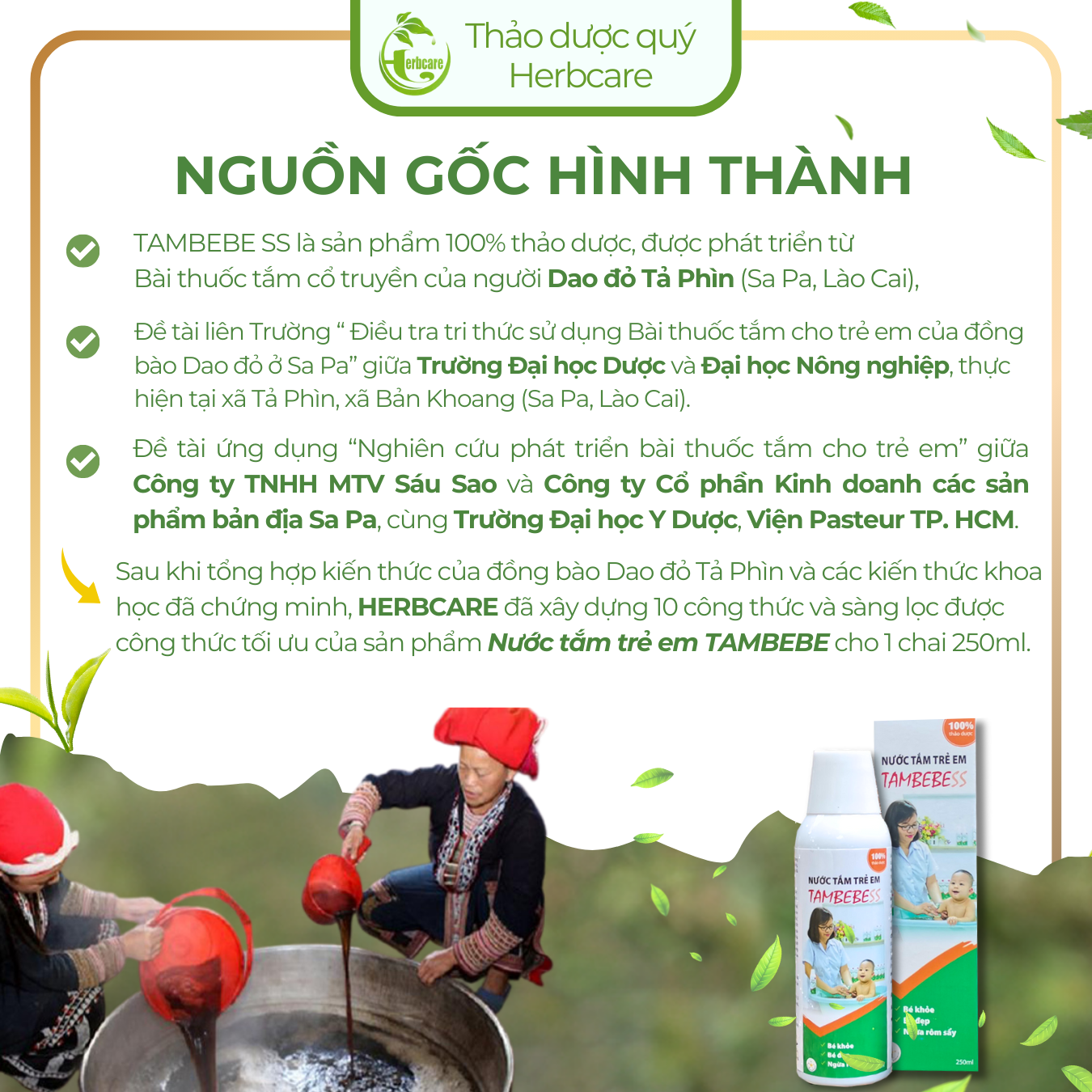Tổng hợp kiến thức của đồng bào Dao đỏ Tả Phìn và các kiến thức khoa học đã chứng minh. Chúng tôi đã xây dựng 10 công thức và sàng lọc được công thức tối ưu của sản phẩm Nước tắm trẻ em tambebe cho 1 chai 250ml gồm:
