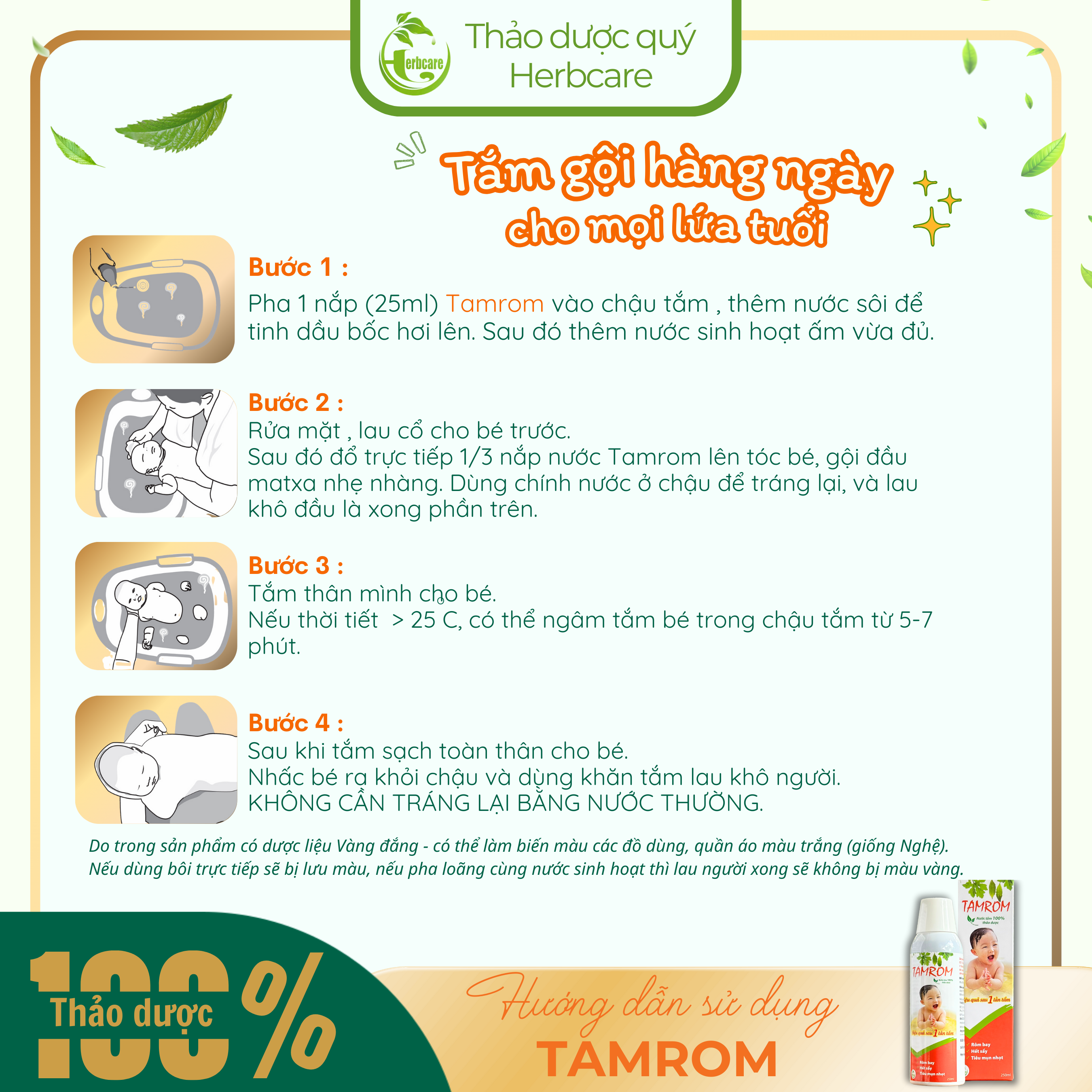 - Cách tắm: Rửa mặt cho bé đầu tiên rồi gội đầu cho bé bằng nước tắm Tamrom, sau đó tắm thân mình của bé. Nếu thời tiết ấm có thể ngâm khoảng 5-10 phút. Khi tắm xong lau người cho bé bằng khăn mềm, không nên tắm lại bằng nước khác.