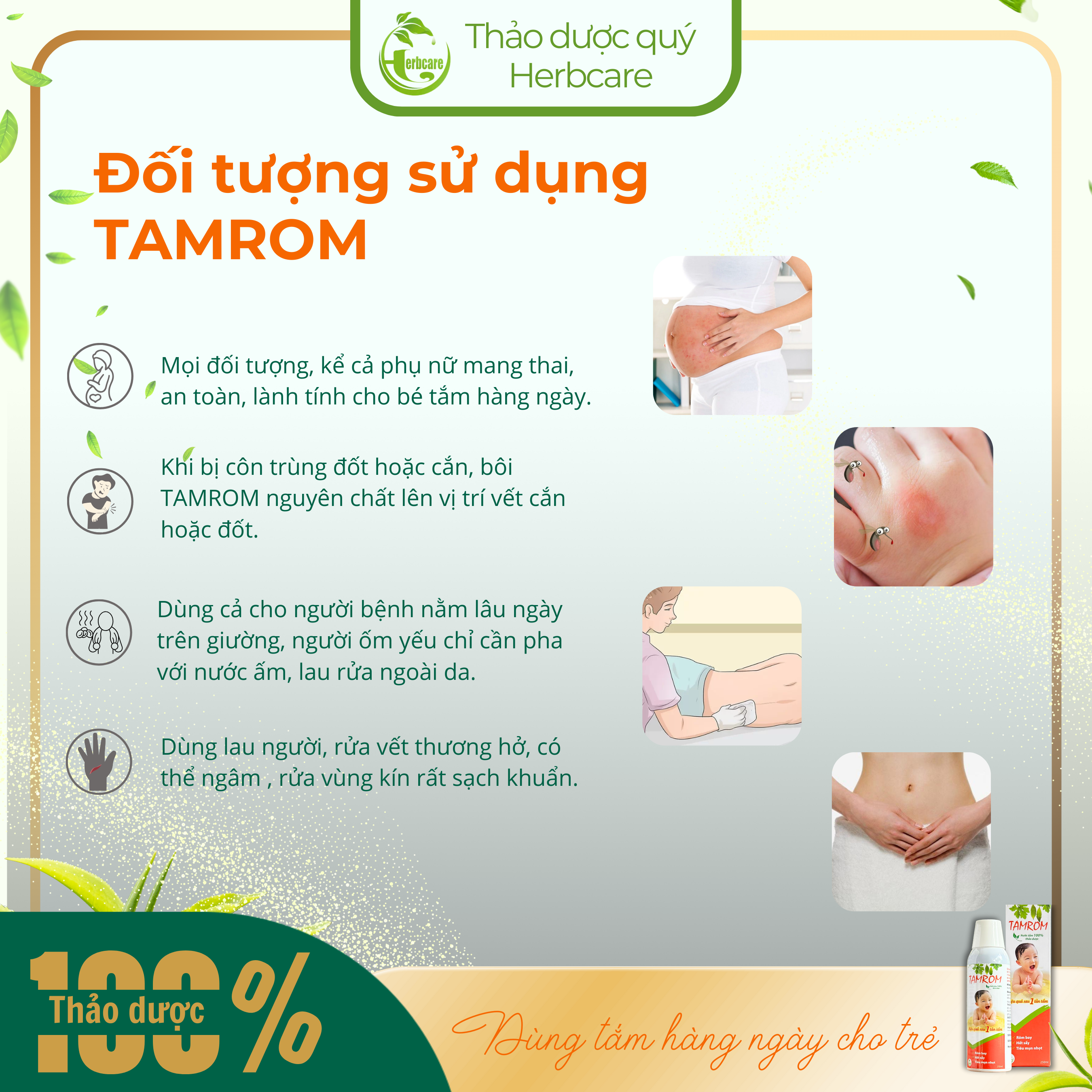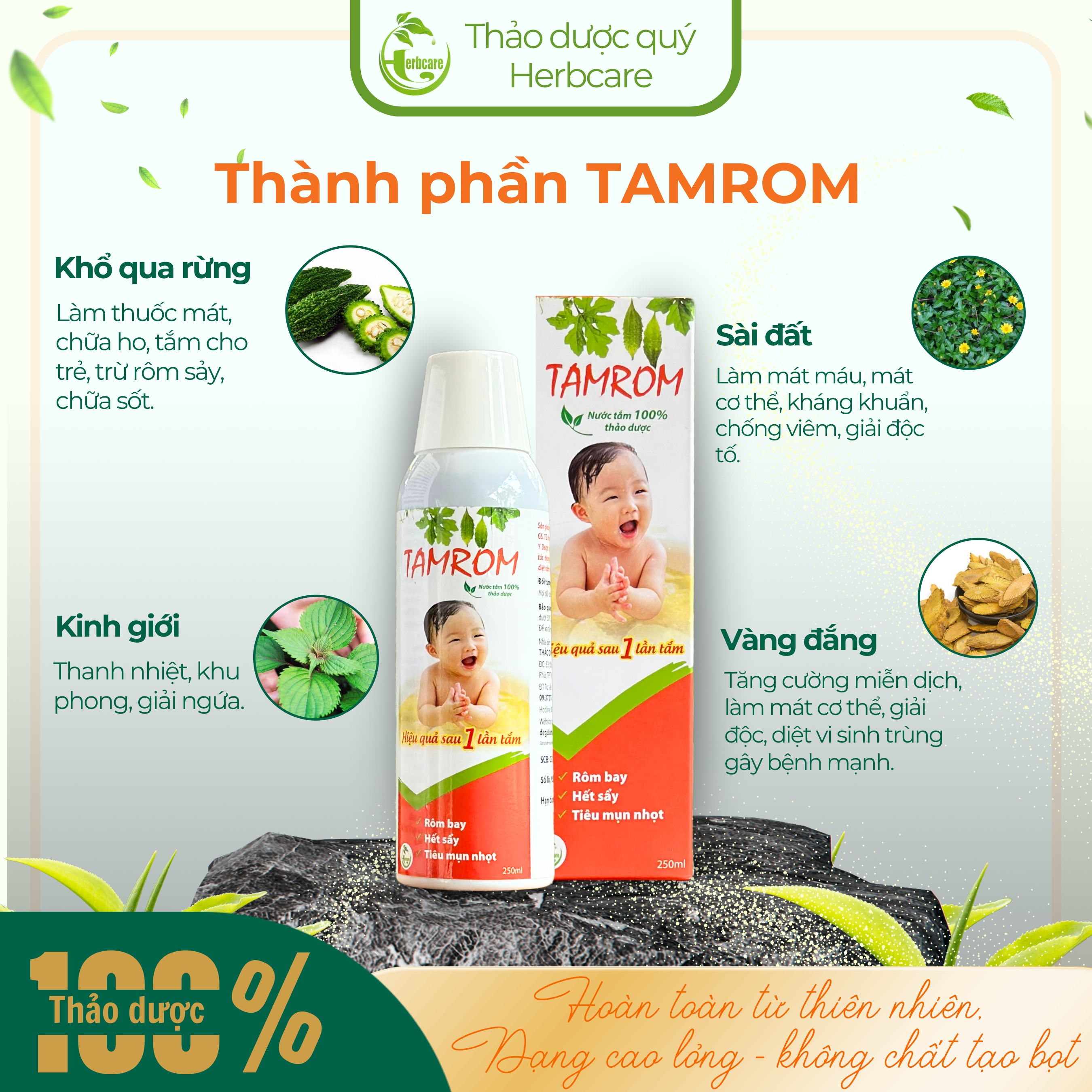 Nước tắm thảo dược thiên nhiên Tamrom ngăn ngừa rôm sảy, lở ngứa, "cứt trâu" và các bệnh ngoài da. Tamrom dùng để tắm gội cho trẻ sơ sinh, trẻ nhỏ và cả người lớn. Hiệu quả ngay sau 1 lần tắm ngừa rôm sảy, lở ngứa, "cứt trâu", làm mát da, cân bằng pH.