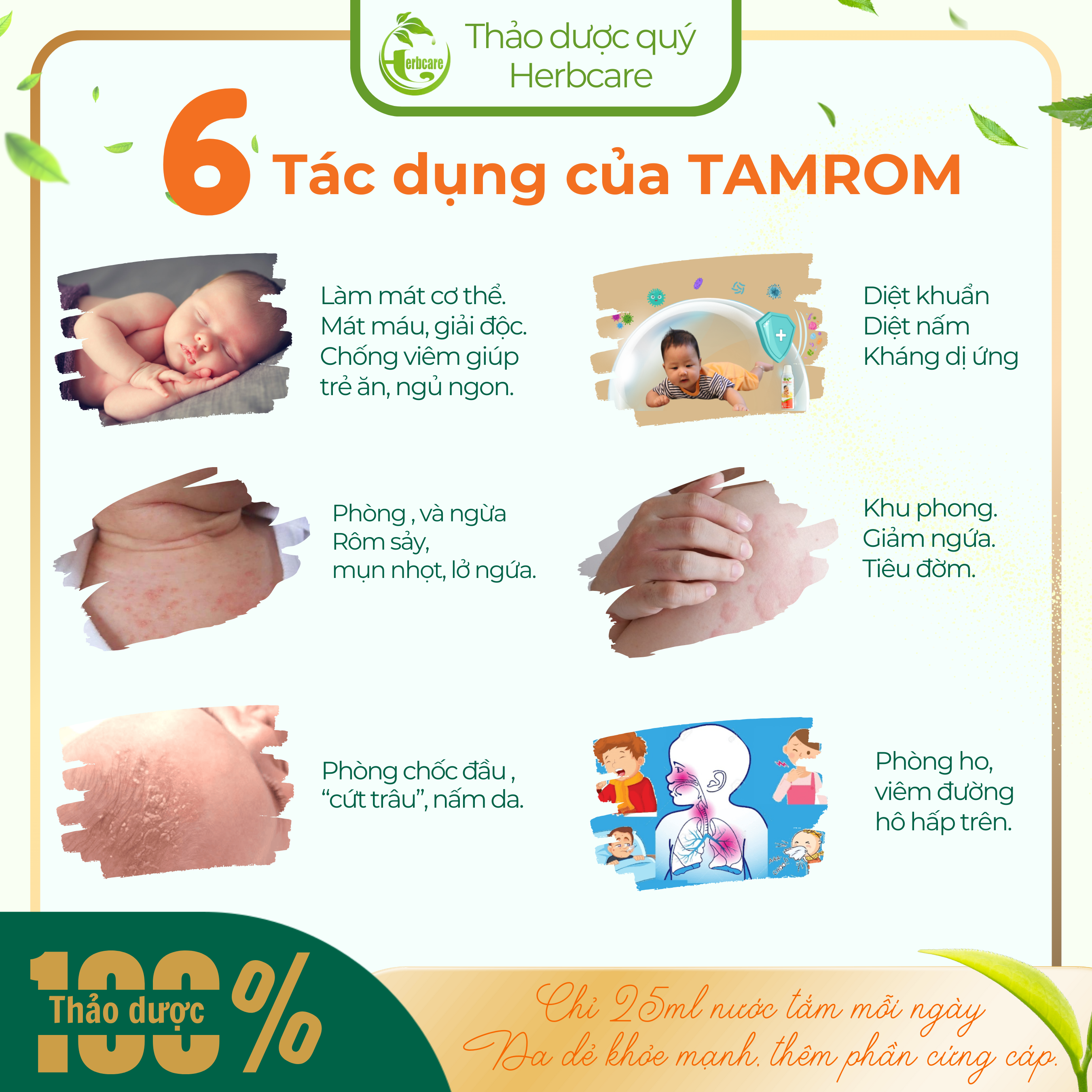 Tamrom trị rôm sảy có tác dụng thanh nhiệt, giải độc, kháng khuẩn, kháng nấm, kháng dị ứng, chống viêm, làm mát cơ thể. Phòng và ngăn ngừa rôm sẩy, mụn nhọt, lở ngứa, chốc đầu, “cứt trâu”, ho, viêm đường hô hấp, cảm cúm. Giúp da luôn tươi mát và không bệnh tật.