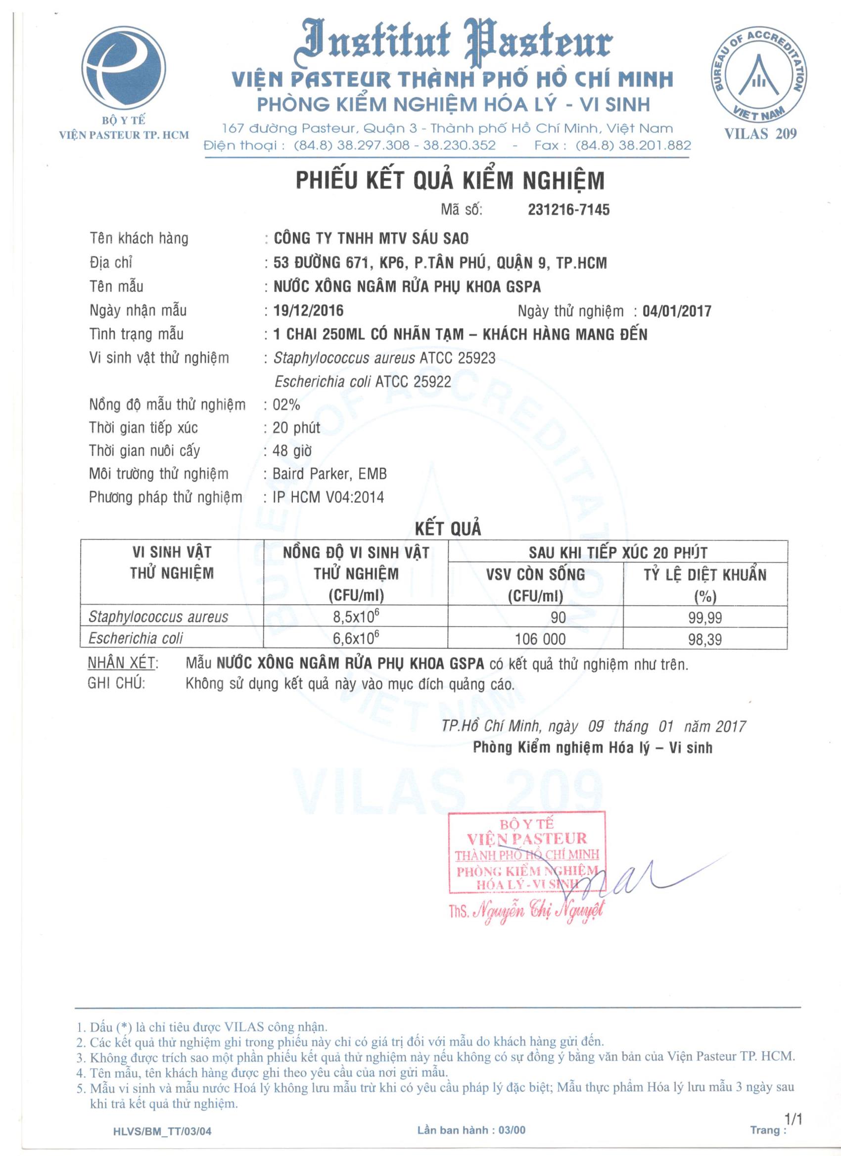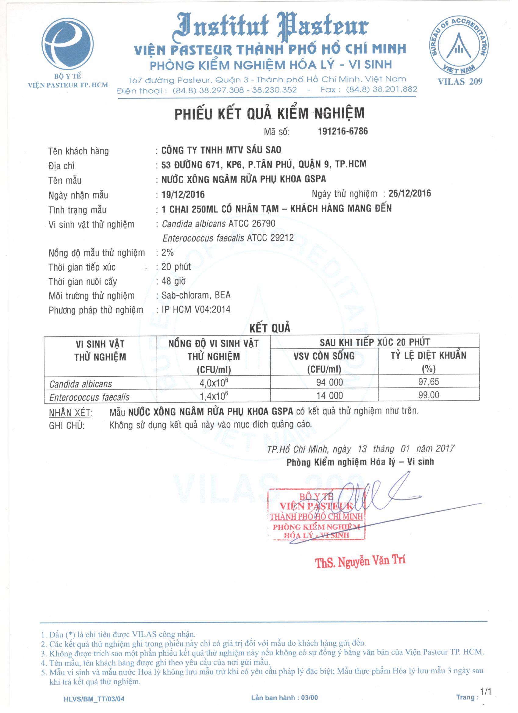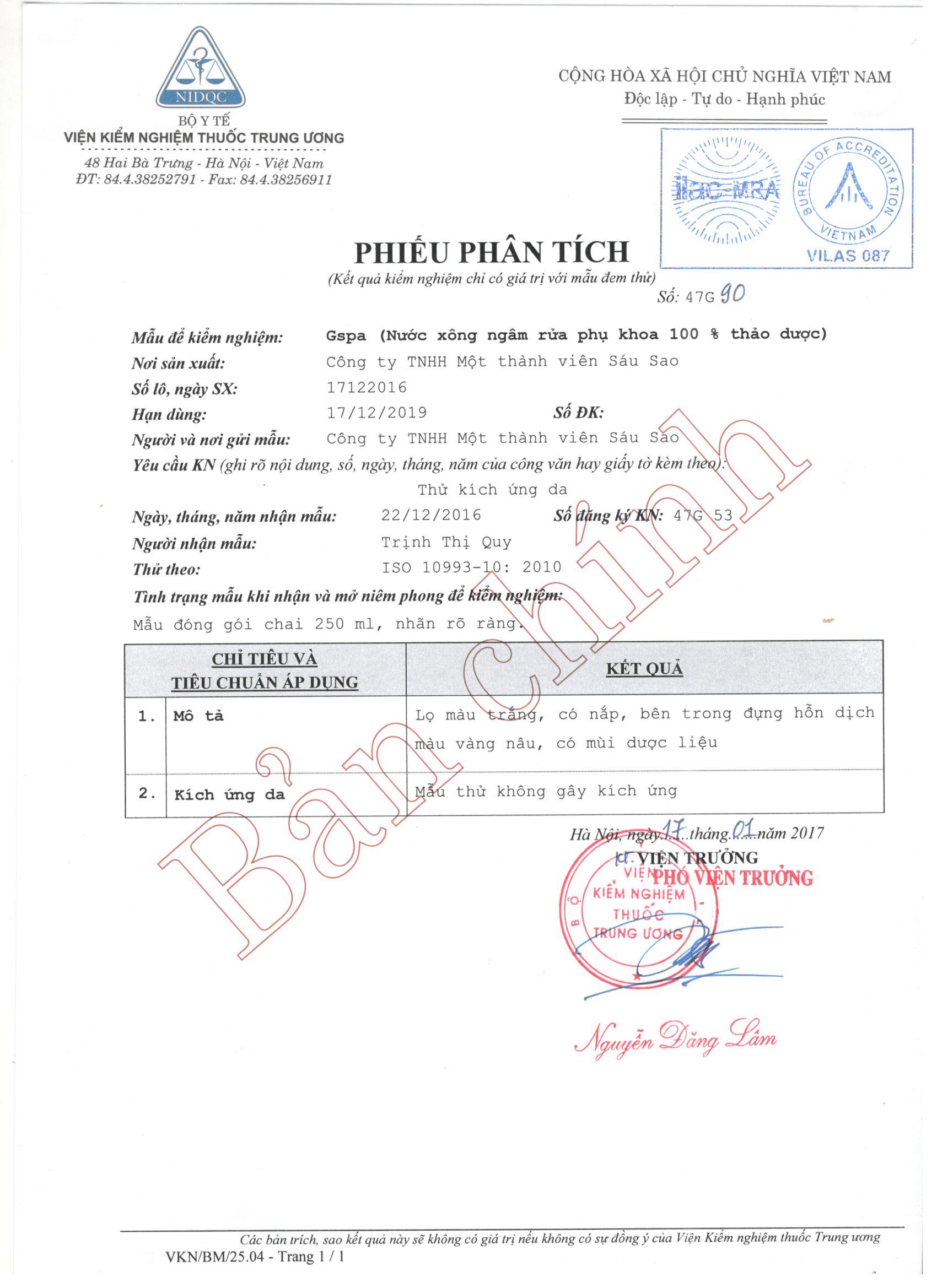 Bên dưới là PHÂN TÍCH kết quả kiểm nghiệm gspa - Nước xông ngâm rửa phụ khoa